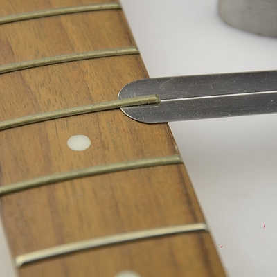 3、如果出现了严重的打品,弦很高仍旧打品,那么可以用工具把品丝撬起来些,甚至在品丝下面垫上点填充物,以提升这个品丝的高度。如果要求较高还可以购买全新的品丝,进行更换。