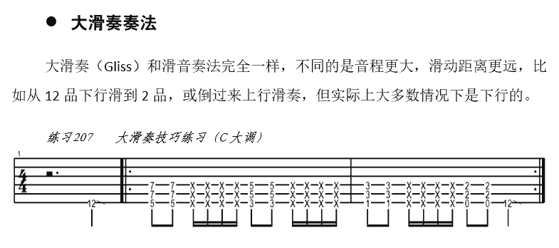 大滑奏技巧非常常用,相当于钢琴上的快速略过每个琴键,通常是下行,但也可以上行。