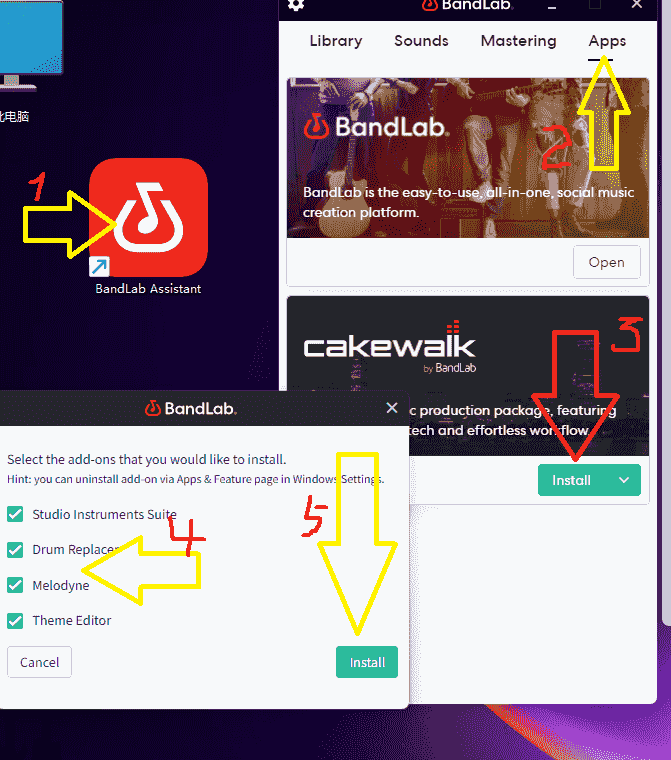 助手安装成功后,打开他,点击APP,再点击Cakewalk By Bandlab,再勾选需要的附加内容,最后开始下载。