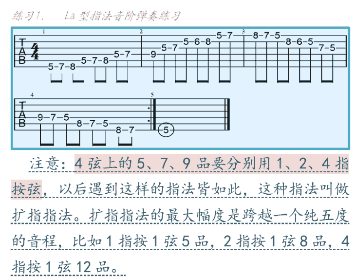 显然谱例中的3弦si音非常不好办,他要你临时弹奏第四把位,其他弦都是第五把位,只有3弦是第四把位,但是初学入门阶段的弹奏联系基本上都是这样弹的。