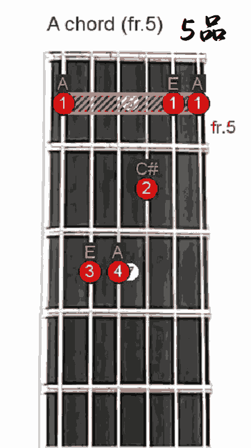 第五把位音阶称作LA型音阶,这跟G调的第一把位音阶指法完全相同,所以和弦按法也是一模一样,只是需要用到1指来横按5品而已,当然同样按法的和弦名称要变一变。