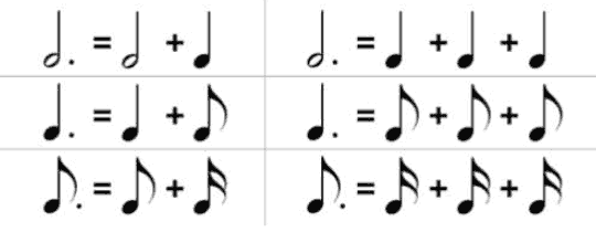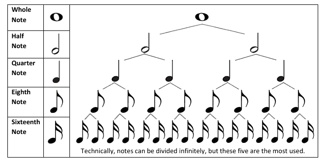 音符长度的计算就像算术中的分数:两个二分音符,或四个四分音符的时间与一个全音符的时值相同。