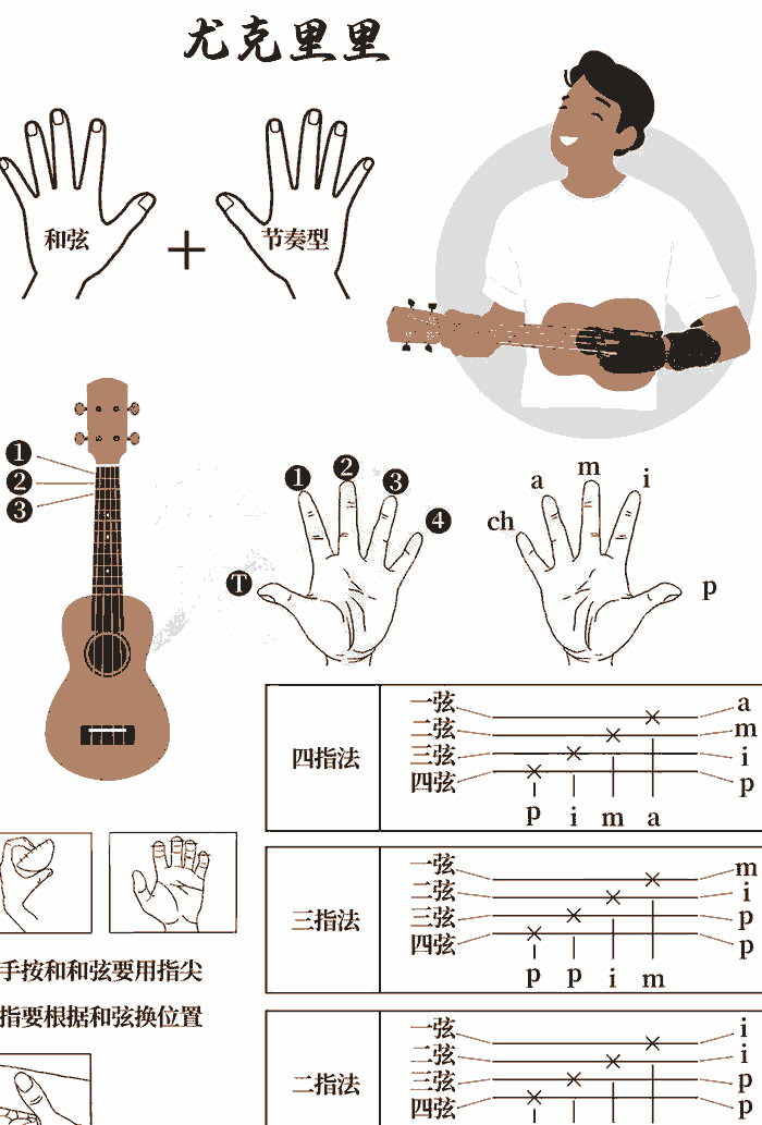 拨弦乐器指法谱对应每根弦每个品格,还会标记手指、拨弦方向,以及泛音、颤音等技巧符号。