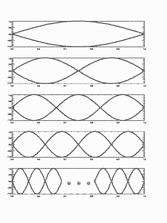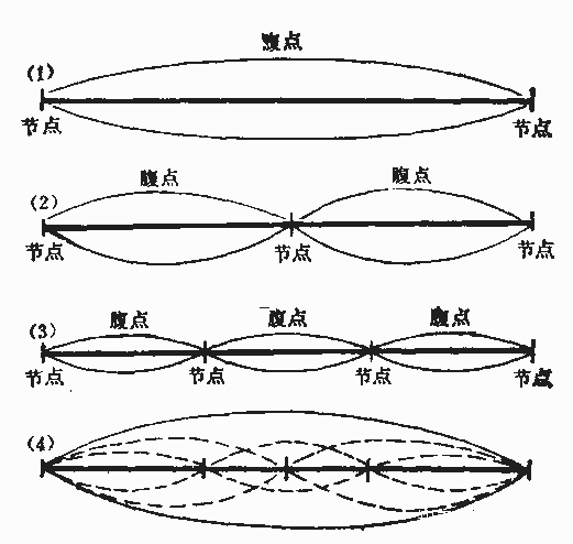 注意:吉他弦上的驻波是波在琴弦的两端不断反射后叠加生成的,很有趣的规律就是波撞在固定端反射的时候是相位相反的,之所以反相是因为不反相就不会叠加为0,而两个端点处肯定是不动的,振幅必须为0..