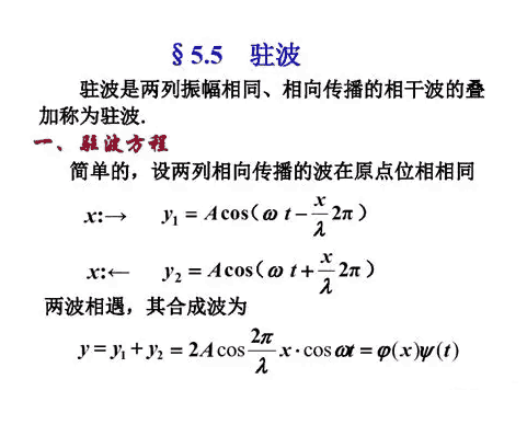 驻波方程:y = y1 + y2 = 2Acos(2πx/λ) * cos(ωt)