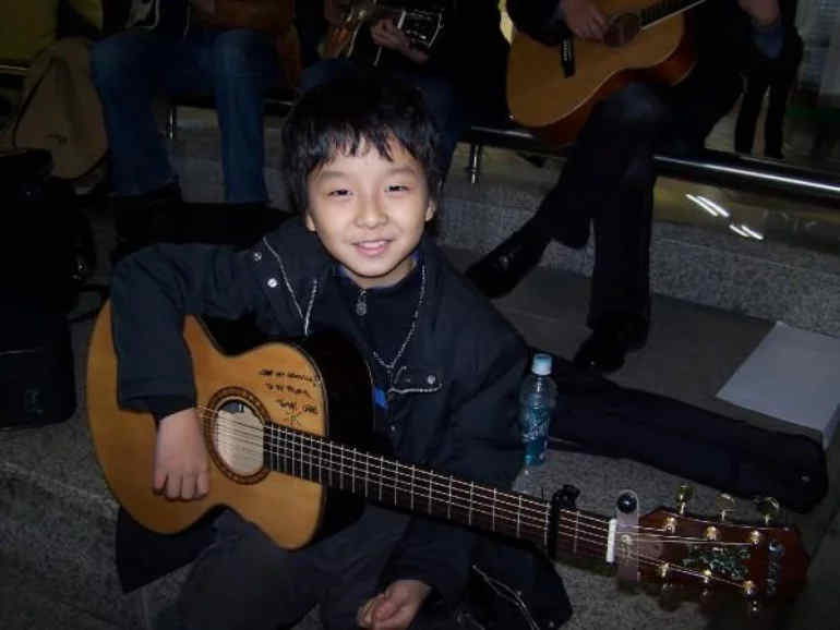 Jung在九岁时收到了他的第一把吉他,这是一把非常粗糙的胶合板吉他。