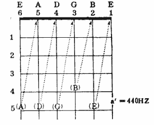 3、降半音调弦在金属摇滚吉他中大量应用,每根弦的音高是:
